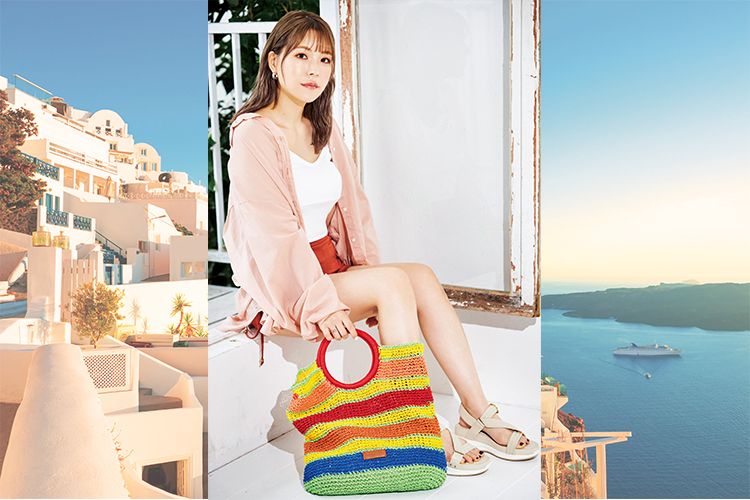 バッグ ¥15,900(Desigual/デシグアル ストア 原宿)、シャツ ¥24,200(YANUK/カイタックインターナショナル)、キャミソール ¥3,443(DHOLIC LADIES/ディーホリック)、ショートパンツ ¥11,880(AMBIENT/アンビエント)、ピアス ¥3,700(FULL OF GRACE/ズットホリック)、サンダル ¥8,140(RANDA/ランダ)